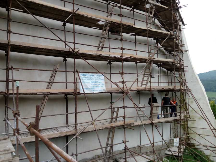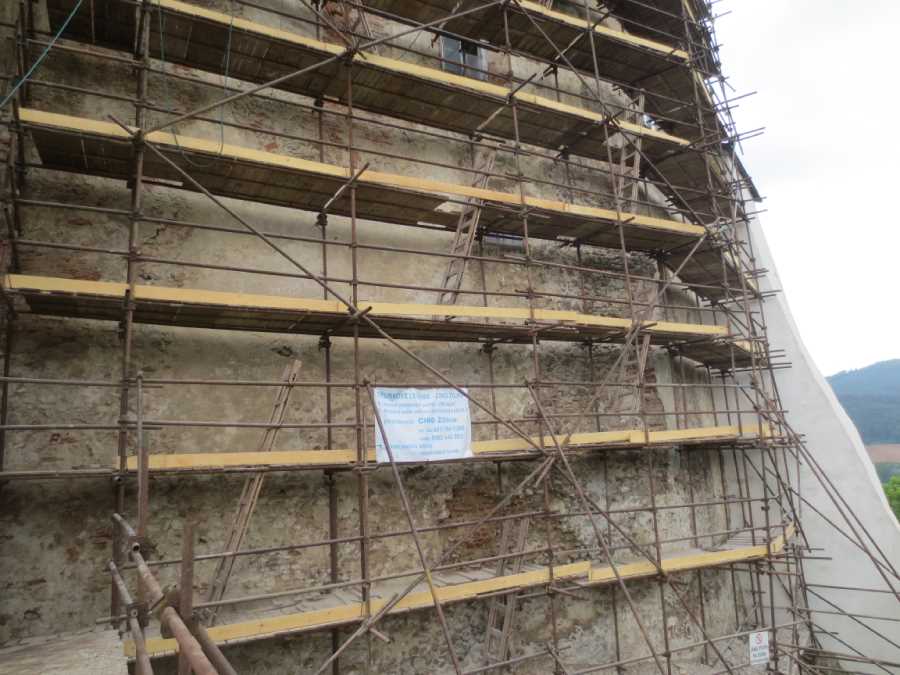 Okrem riešenia spomínaných problémov, zapríčinených často zlým stavom klampiarskych prvkov, sme sa museli zaoberať potrebou údržby sokla v spodnej časti fasád. Problém sme riešili systémom podrezania a na niektorých miestach vyplnenia pôvodným kamenivom. Voda v murive so sebou prinášala, okrem výkvetov vodorozpustných solí, aj oddeľovanie jednotlivých vrstiev – predovšetkým omietky od podkladu.