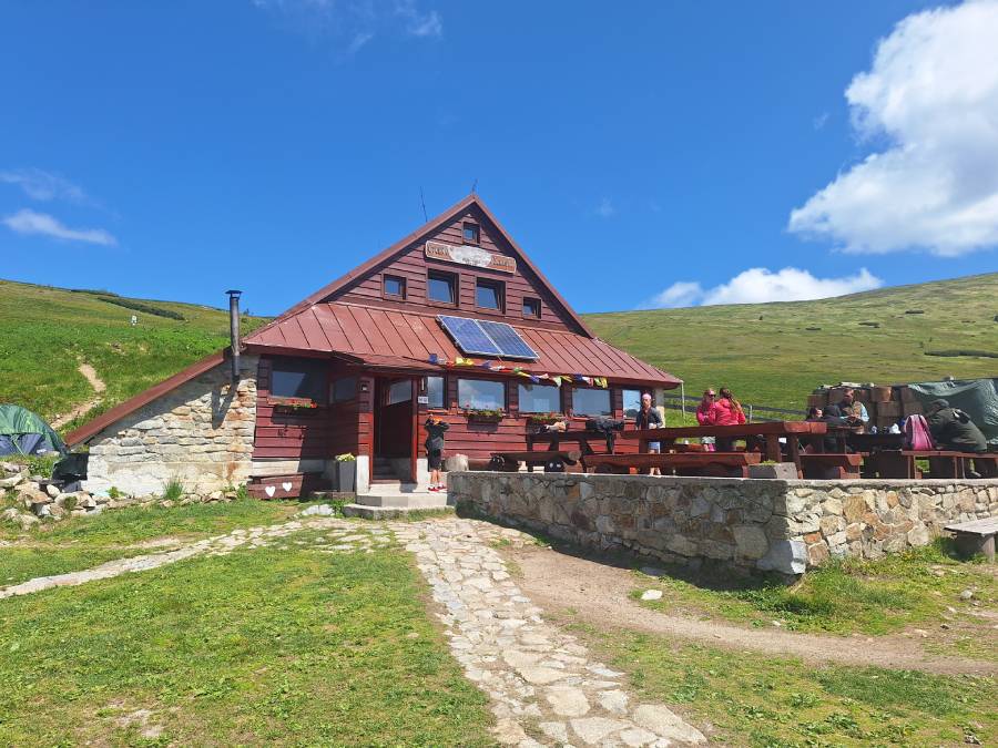 Neskôr z lesa vychádzame a ukazujú sa nám vrcholy Nízkych Tatier. V diaľke zazrieme na širokom zelenom poli útulňu. K nej nás privedie príjemná rovinatá cestička. Prichádzame na miesto a na naše prekvapenie, ani tu nie je veľa ľudí, čo nás, samozrejme, teší. Nie každý možno vie, že útulňa bola postavená na niekdajšom salaši. Ponúka ubytovanie vo vlastných spacákoch a kto chce, môže stanovať vonku za symbolický poplatok. Chatári sú milí, v ponuke majú viaceré jedlá a nápoje. Dá sa sedieť aj v interiéri. Chata je tou pravou útulňou so všetkým, čo k nej patrí. Jej návštevu rozhodne odporúčame, otvorená je celoročne. Najmä počas leta tu stretnete mnoho turistov, „esenpéčkarov,“ ale aj tých, ktorí zdolávajú hrebeň Nízkych Tatier. Sadneme si na terasu, objednáme si niečo tekuté na osvieženie a pozeráme smerom nahor – k vrchu Chabenec.