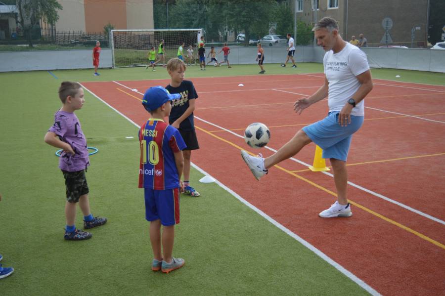 Roman Skuhravý, hlavný tréner A-tímu FK Železiarne Podbrezová, vysvetľuje chlapcom  základy futbalu počas turnaja v Brezne. Foto: archív FK ŽP