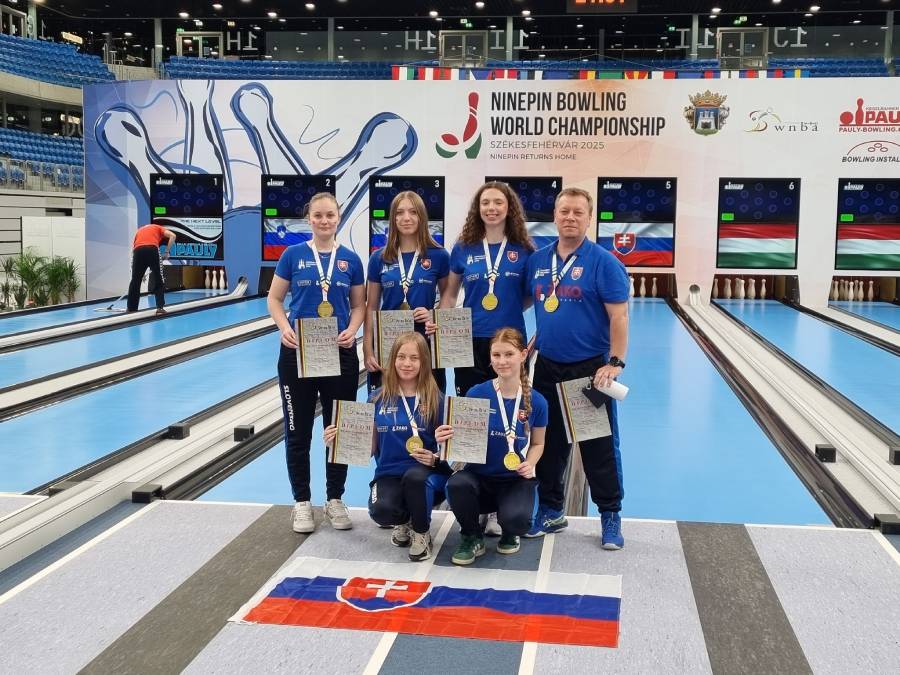 Dievčenské družstvo Slovenska U19 so zlatými medailami.	Foto: SKoZMaďarský Székesfehérvár bol v aktuálnom roku dejiskom svetového šampionátu v kolkoch. V máji najskôr bojovali o najcennejšie medaily mládežnícke kategórie, na prelome mesiacov máj a jún následne aj hlavné kategórie mužov a žien.