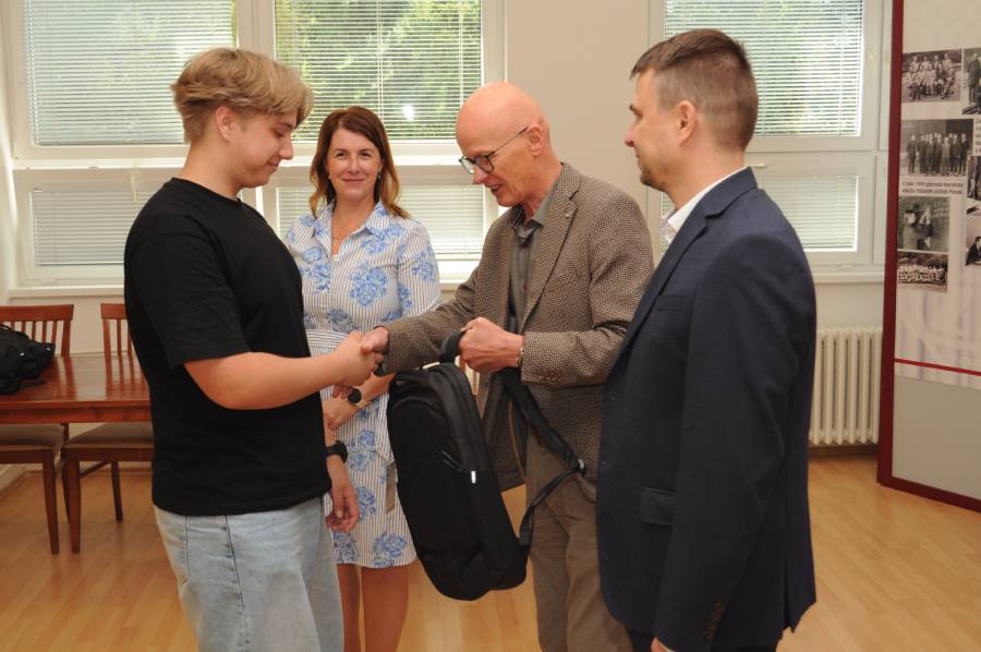 Ján Gaboň (v strede) odovzdáva notebook jednému zo študentov. Vedľa neho Ján Villim a Miriam Pindiaková. Foto: J. ČiefStalo sa už tradíciou, že v úvode školského roka dostávajú prváci Súkromnej spojenej školy Železiarne Podbrezová v profiláciách Informatika a STEAM nové notebooky. Výnimkou nebol ani tohtoročný september.