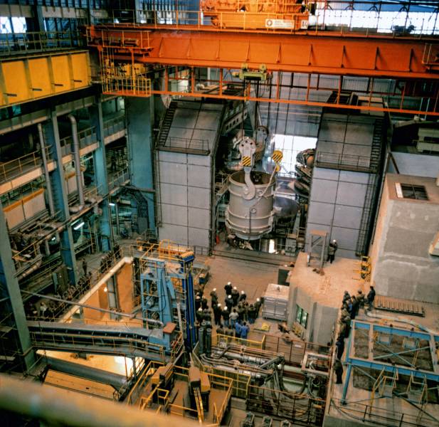 Pohľad na sadenie šrotu z prvého koša. Foto: A. NociarováSúbežne s montážou prebiehalo aj školenie pracovníkov taviacej a panvovej pece, aby sa dokonale oboznámili s novým technologickým zariadením a naučili sa ovládať a riadiť celý proces výroby ocele prostredníctvom výpočtovej techniky. Praktické skúsenosti získala vybratá skupina pracovníkov v októbri roku 1992 na školení v oceliarni Brescia v Taliansku. Tam totiž bolo podobné zariadenie. Školenie budúcej obsluhy pece prebiehalo súbežne s budovaním. Koncom roku 1992, počas intenzívne prebiehajúcich montážnych prác, bolo nevyhnutné definitívne rozhodnúť o odstavení obidvoch oceliarní. V bezprostrednej blízkosti staveniska totiž prebiehala výroba ocele v troch SM peciach a v dvoch elektrických oblúkových peciach. Na zrušenie starých pecí, ich demontáž, zbúranie základov, demontáž plošín, atď. bol odhadnutý čas v rozpätí štyroch mesiacov. Vychádzajúc z tohto predpokladu, bolo rozhodnuté, že odstavenie prevádzky všetkých pecí sa uskutoční v nočnej zmene z 1. na 2. novembra 1992. Výroba SM ocele bola po stotrinástich rokoch úplne zrušená. Výroba elektroocele na dvoch tridsaťtonových elektrických oblúkových peciach bola po tridsiatich dvoch rokoch prakticky prerušená, pretože mala pokračovať po dobudovaní novej elektrooceliarne modernejšou technológiou. Na určitý čas sa odstavením výroby ocele prerušila aj zásobovanie valcovne bezšvíkových rúr vsádzkovým materiálom z vlastnej výroby a v tom čase bol uvedený materiál zabezpečovaný nákupom zvonku. Koncom roka 1992 prebiehali intenzívne búracie práce v halách siemens martinskej oceliarne a elektrooceliarne.