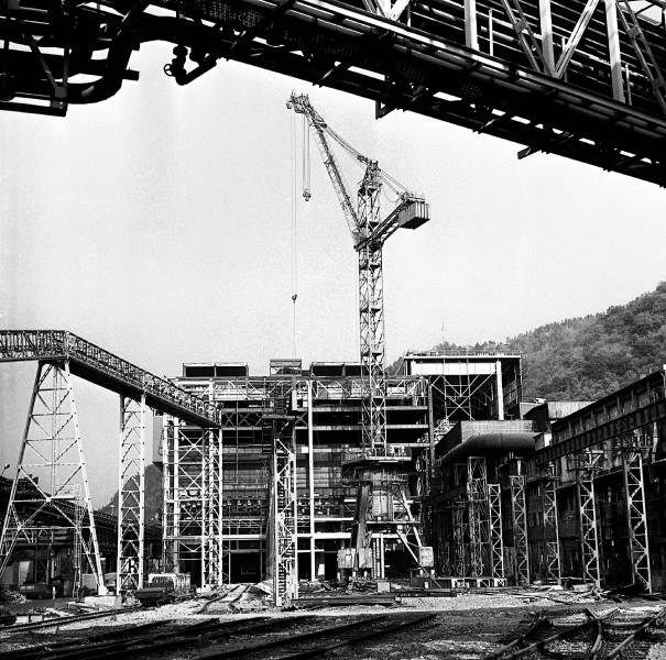 Celkový pohľad na výstavbu haly oceliarne objektívom A. NociarovejDemolačné práce valcovne profilov a spolusúvisiacich objektov boli ukončené 6. marca 1991, vtedy sa mohla naplno rozbehnúť výstavba novej elektrooceliarne. Nakoľko pri povoľovacom konaní stavby stanovilo ministerstvo len krátku lehotu výstavby a uvedenia elektrickej oblúkovej pece do prevádzky (marec 1993), znamenalo to, že projekčné a všetky dodávateľské organizácie, spolu s investorom, mali na uskutočnenie tejto veľmi náročnej stavby k dispozícii už len dva roky. Začali sa ozajstné preteky s časom a veľmi zložitá organizačná práca investora, aby v podstate v obmedzenom čase zabezpečil výrobu v dvoch oceliarňach a súčasne organizoval výstavbu, vyžadujúcu presuny hmôt. Sústavne sa uskutočňovali rokovania s talianskymi dodávateľmi technológie.