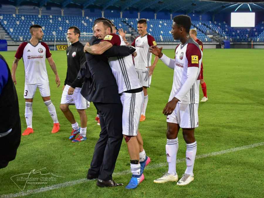 Autor dvoch gólov proti Seredi, Michal Breznanik, v objatí s trénerom Marekom Fabuľom. Foto: M. SlávikZápas na štadióne v Nitre začali obe mužstvá opatrne. Prvú strelu na bránu domácich vyslal v 7. minúte Breznanik, keď si sám vybojoval loptu v strede ihriska a jeho pokus skončil vedľa brány. Domáci odpovedali o sedem minút neskôr, Ventúra spoza šestnástky pálil nad bránu. V 19. minúte poslal z pravej strany prudký prízemný center Magda a pred nabiehajúcim Mikušom zabránil domáci obranca čistej šanci. Skóre otvoril domáci Gatarić v 28. minúte, keď Ulrich zľava naviazal troch hráčov hostí, prihral na hranicu šestnástky a ľavačkou trafil do horného kúta Kuciakovej brány. V závere polčasu sa k zakončeniu dostal Turňa, jeho strela letela tesne vedľa brány domácich a po ďalšej výbornej práci Ulricha zakončoval zblízka Morong, no Kuciak ho vychytal. V úvode druhého polčasu sprava prudko odcentroval Magda a Mikuš trafil brvno domácej brány. V 64. minúte mohli ísť domáci do dvojgólového vedenia, keď Magda zle vyriešil „malú domov“, ale Ulrich obrovskú šancu na gól nepremenil. Zvrat do zápasu prinieslo dvojité striedanie hostí. Noví hráči na ihrisku Njire a Berandina najprv pripravili gól v 69. minúte Breznanikovi a rovnaký hráč už o minútu z podobnej prihrávky Njireho spoza vápna ľavačkou rozhodol o víťazstve železiarov. V 72. minúte mal možnosť zvrátiť nepriaznivý stav pre domácich aktívny Ulrich, no jeho presnú strelu bod hornú žrď bravúrne vyrazil Kuciak. V šiestom kole Fortuna ligy sme tak na pôde súpera zvíťazili a pripísali si dôležité tri body.